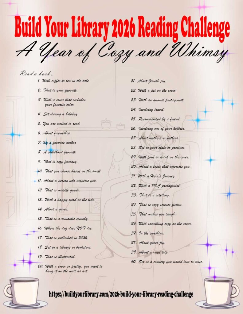 I can’t wait to dig into this year’s reading prompts! This year’s challenge encourages you to find your sense of whimsy and read books that make you feel happy and cozy. 2025 was a difficult year for many of us, so I wanted to start 2026 with a reading challenge to help me rediscover my love of reading!