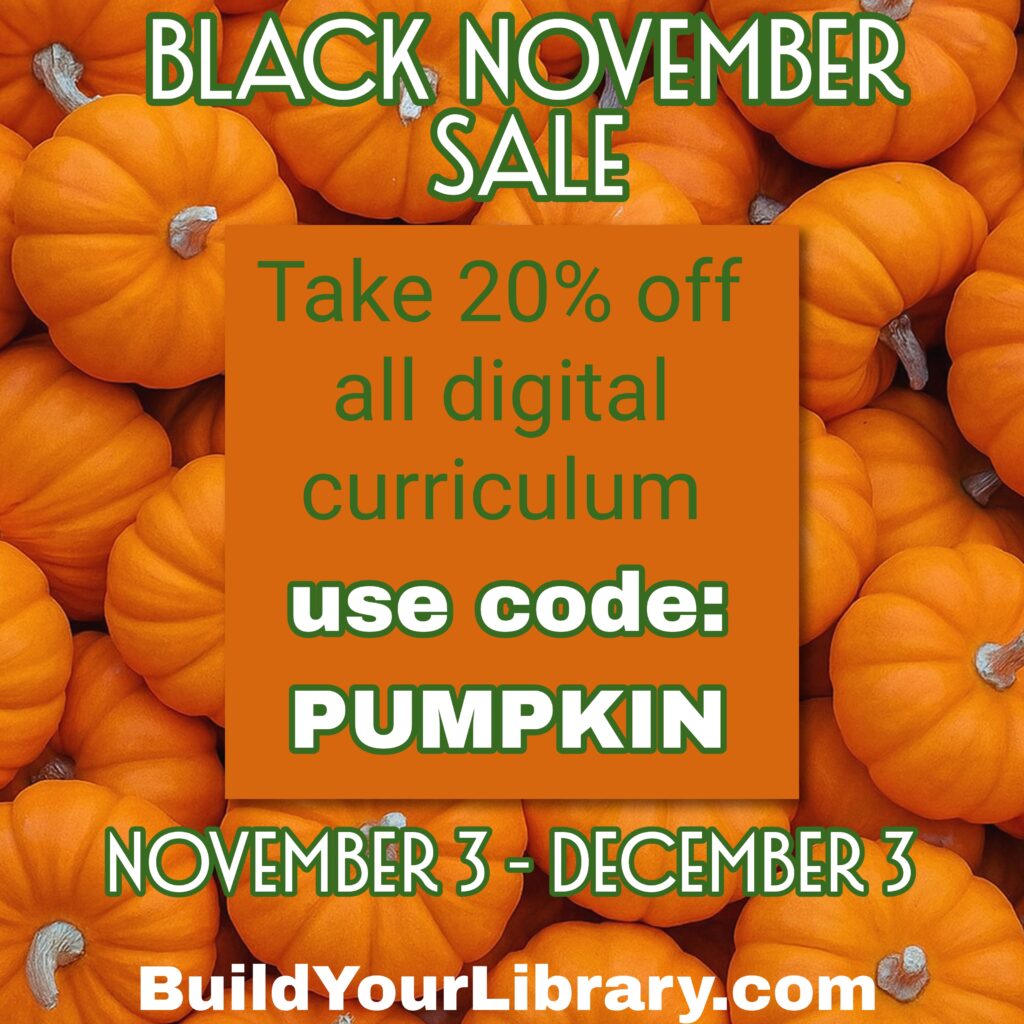 You can take 20% off of all our products during our “Black November” month-long Holiday Sale. Our sale runs from November 3rd through December 3rd, encompassing Black Friday, Cyber Monday, and the entire month of November. This includes all of our digital full-year programs, unit studies, Lit Bites and more!